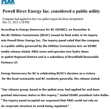 BC Hydro points out in its submission “PREI could sell its electricity to, for example, any parties on its side of the point of interconnection of BC Hydro’s system, which it has done in the past before the paper mill at the site closed in 2021.” That means, for example, there's nothing to stop PREI from selling to the parties who are interested in redeveloping Powell River's mill site.