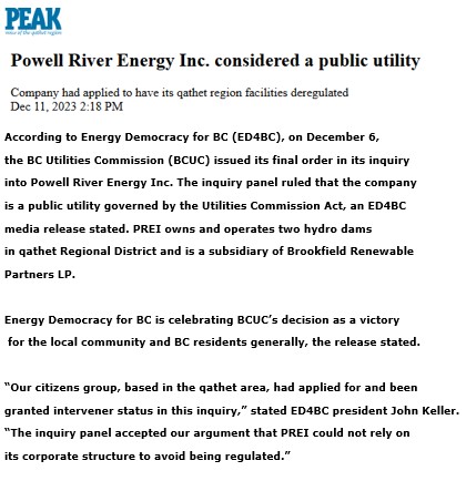 Plus, we’ll have an update on Powell River Energy’s application to export all locally produced electricity to the U.S. for 30 years